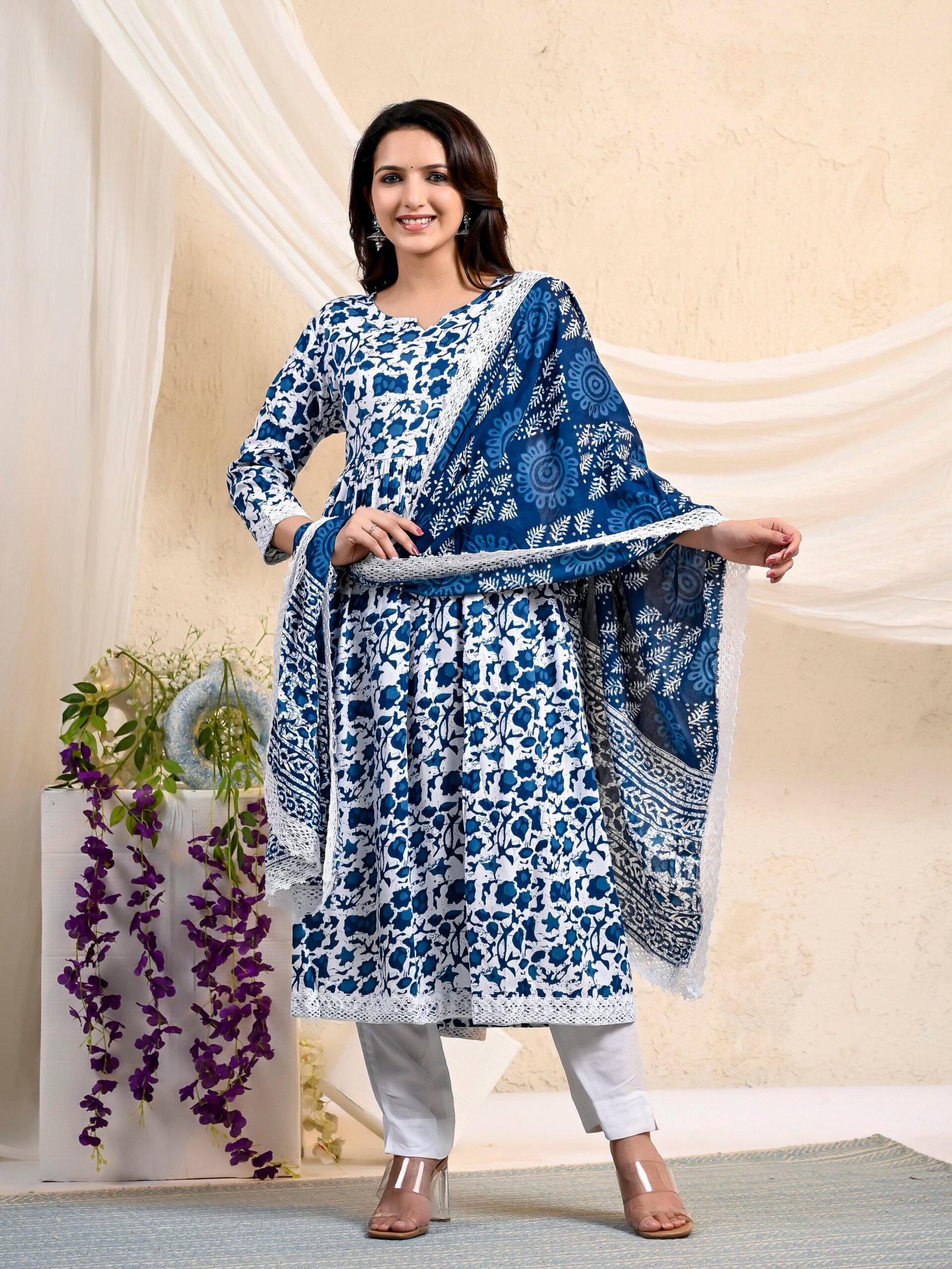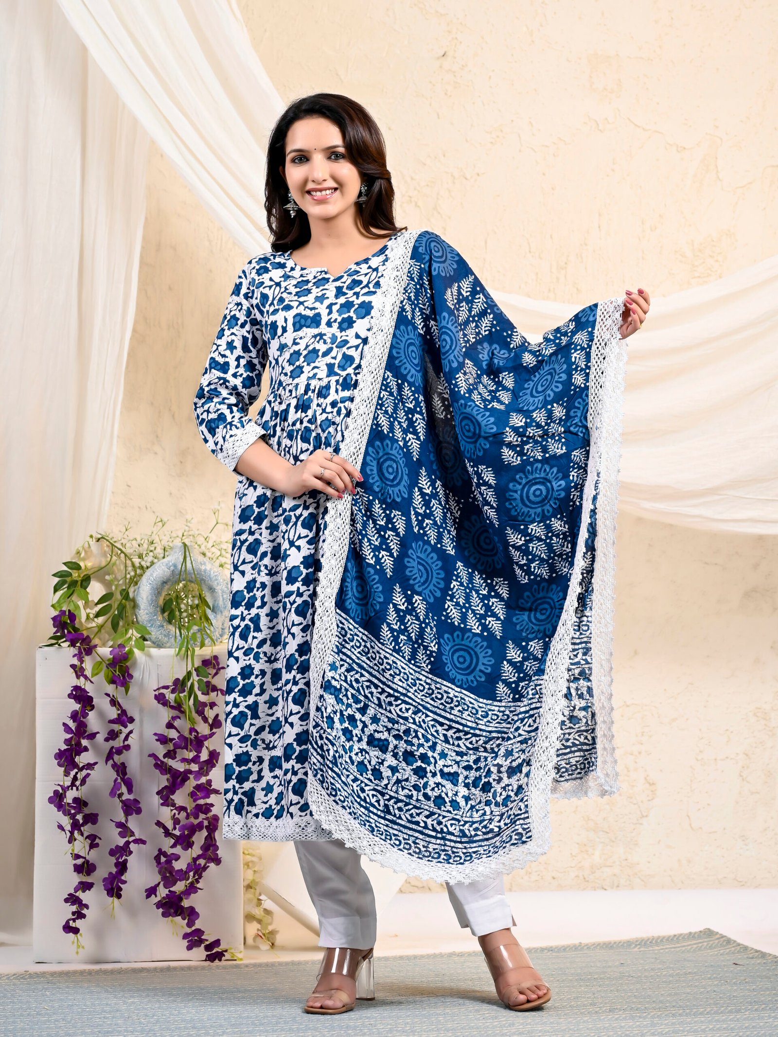 Blue White Rayon Digital Printed 3PC Kurti Pant With Dupatta